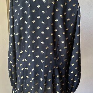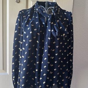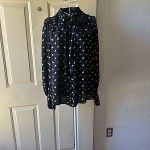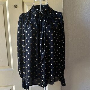 Elegant black blouse with gold geometric pattern. Features a stylish bow tie at the neck. Perfect for office or evening wear.