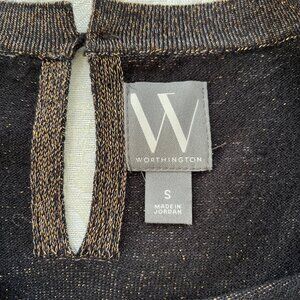 Worthington sweater vest is size S. Material is stretchy. Color is black with gold/metallic thread woven throughout. Vest is in very good condition. Also listed on Mercari and eBay.