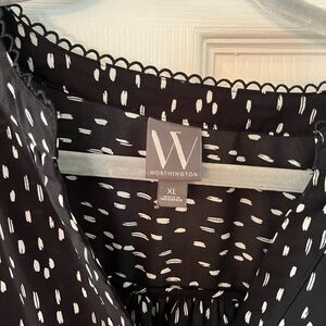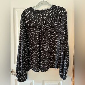 Chic black blouse with white dot pattern. Flowy and elegant design. Perfect for versatile styling.