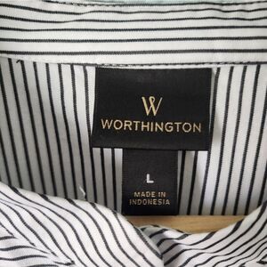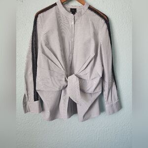 This stylish top from Worthington features a striking black and white design, perfect for adding a touch of elegance to your wardrobe. The asymmetrical button-down style is complemented by a chic tie-front detail, while the mandarin collar adds a modern twist. Ideal for both casual and formal occasions, this top is a versatile addition to any collection.