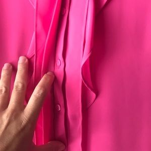 Ruffles add to the beauty of this blouse. Hidden buttons down front for easy on, easy off. The material is very lightweight so perfect for warm weather or for layering. 100% polyester.
