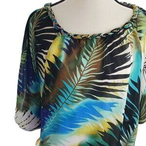 Gorgeous beach tropical design, fitted elastic bottom, flowing Dolman sleeves, chain rope neck detail, semi-sheer, perfect condition.
