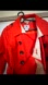 Striking red trench coat with double-breasted buttons. Stylish and versatile for any occasion.