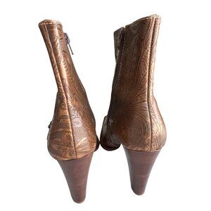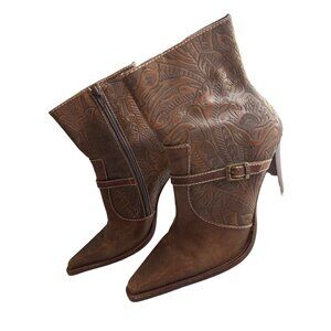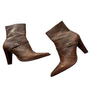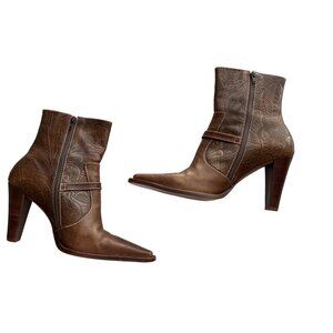 Worthington Brown Leather Pokus Embossed Pointed Toe 4”High Heel Boots 9.5