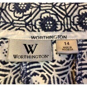 Worthington capri pants, womens size 14 pants, cotton blend capris, blue patterned print pants, Worthington womens clothing, summer capri pants, office casual pants, cropped trousers womens, Worthington textured pants, geometric print capris, womens size 14 Worthington, comfortable capri pants, mid rise capris, casual summer pants, machine wash capris
