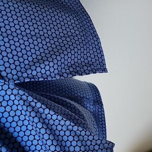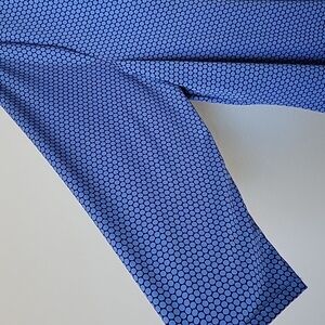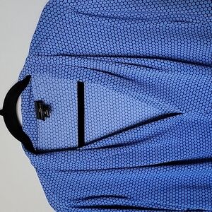 Navy blue background with lighter blue dot print all over. V neck with a layered/ gathered like look. 3/4 sleeves. Stretch fabric. Side split hem. Great condition. office, workplace, curvy, plus, dinner, date night, brunch, church