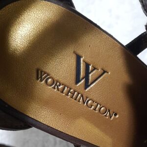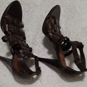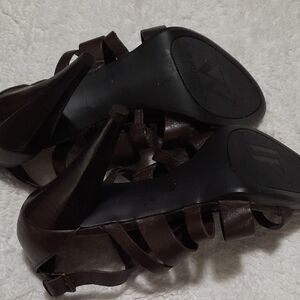 Chic dark brown sandals with woven straps. Adjustable buckle for a secure fit.
