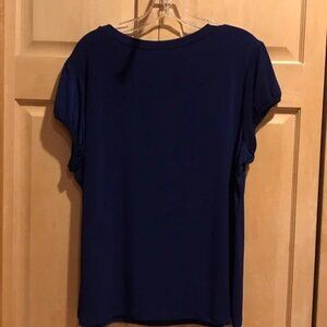 Chic deep blue blouse with short sleeves. Perfect for work or casual outings. Soft and comfortable fabric. Stretchy knit.