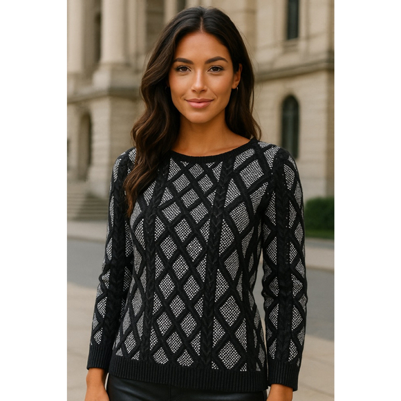 Diamond knit sweater, black and white pullover, cable knit, geometric chic, bold pattern, classic knitwear, cozy chic, textured sweater, modern layering, boutique knit, statement sweater, upscale casual, timeless design, chic casual, fall layering, minimalist luxe, capsule wardrobe, contemporary style, versatile pullover, bougie billionaire vibes, neutral chic, refined casual, trending knitwear, structured pullover, city chic, high contrast knit, polished cozy, boutique style, luxe layering piece, modern neutral.