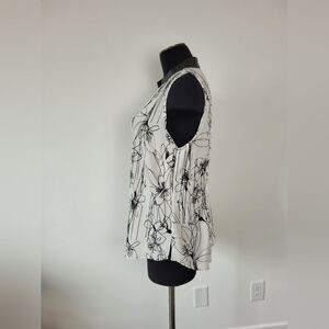 Very flattering sleeveless blouse top in a white and black Artsy floral print. Faux leather trim on the collar and hidden buttons down the front. Great condition. Size medium, measures approximately 27 inches long 18 inches underarm to underarm laid flat.