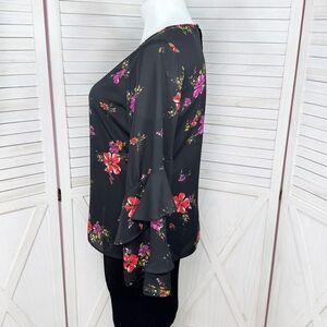 Worthington Floral Tiered Ruffle Bell Sleeve Blouse Black Pink Large