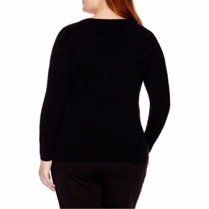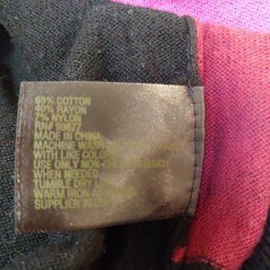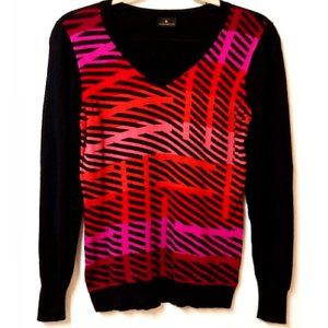 Worthington geometric print v-neck sweater. Pretty fall sweater in pinks, oranges and reds, with black sleeves and back. Such a cute top, easy to dress up or down. Good pre-owned condition; slight wash wear and pilling. Please see photos for details.