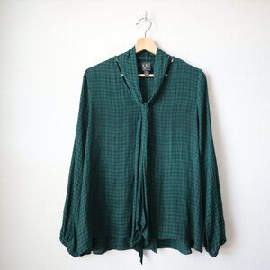 Emerald green satin blouse with attached neck tie detail