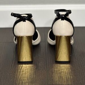 Step into chic sophistication with these Worthington Lambert flared heel pumps—a stunning blend of modern design and timeless elegance. The go-with-everything cream faux-leather upper, contrasted by a gold-tone heel and black ankle buckle strap, makes these the perfect heels for both special events and polished office looks.