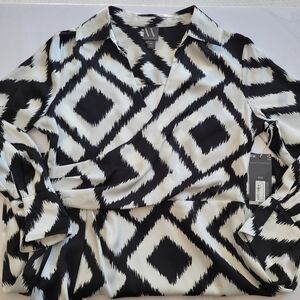 Worthington women's shirt dress featuring a faux wrap for a flattering fit. It's crafted from woven fabric with a spread collar, long cuffed sleeves, and a knee-length.