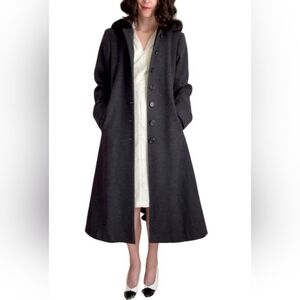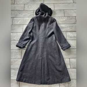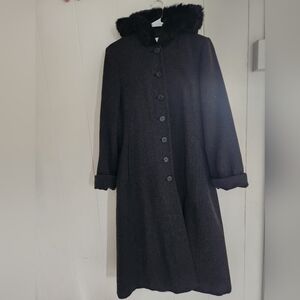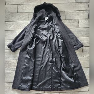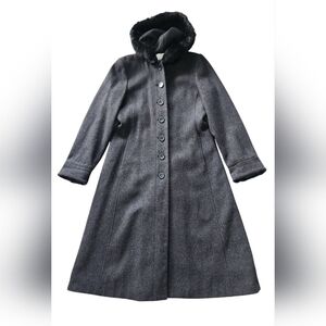 Worthington Long Wool Womens Trench Coat 10 P Rabbit Fur Trim Hooded Gray Vtg