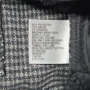 Worthington Modern Fit wide leg pants in a gray and black plaid check design. Features a mid-rise waist, slimming through the hips, and a wide-leg cut for a flattering, tailored look. Crafted from a soft polyester-rayon blend with spandex for comfortable stretch and all-day wear. Perfect for office outfits, business casual looks, or building a versatile minimalist capsule wardrobe. Machine washable and easy care.