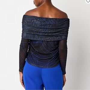 Elegant off-shoulder blouse with a striking black and blue pattern. Ideal for a fashionable look.
