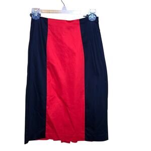 Worthington striped skirt. Colors are black and orangish red. Back is pleated at the bottom. It has loop holes like there was a belt but there isn't one included. These could easily be cut off if not wanting to put a chunky belt with the skirt. Zips in the back. 56% cotton, 42% nylon, 2% spandex. Machine washable. Petite size 4.