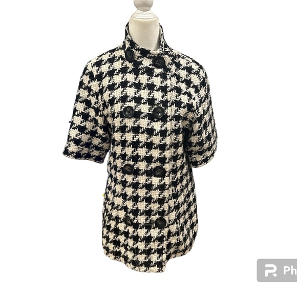 Houndstooth black and white coat. Few straw strands throughout the coat. Shell: 56% Acrylic 84% Polyester 10% Wool. Lining: 100% Polyester.