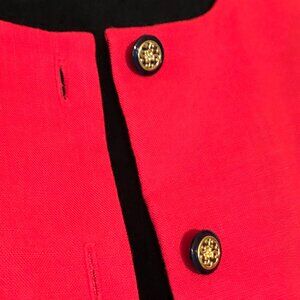 Vintage lightweight short-sleeved blazer with two-tone buttons. This is a nice fitted, unlined red jacket from the 80s with shoulder pads, pleated sleeves, and pretty black and gold buttons. In very good vintage condition.