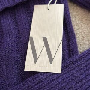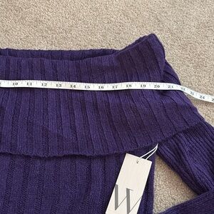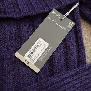 Brand new with tags. See photos for details and measurements. No major flaws. Embrace elegance with this Worthington off-the-shoulder sweater in a rich purple hue. Featuring a wide folded collar and a vertical ribbed knit pattern, this sweater offers a classic and structured look. Crafted from a medium to heavy weight fabric, it's perfect for keeping warm in cooler weather.