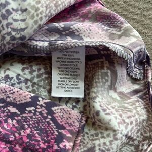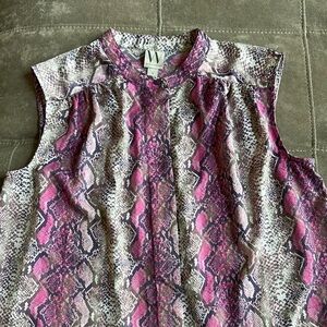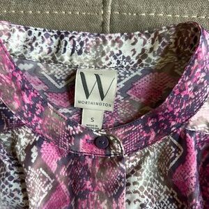 This elegant sleeveless blouse from Worthington showcases a bold snakeskin print in striking purple and gray hues. Featuring a mandarin collar and a flowing silhouette, it offers a modern and sophisticated look. The silky fabric enhances its luxurious feel, making it a standout piece in any wardrobe.