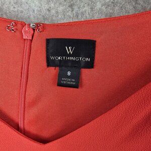 red dress, bell sleeve, Worthington dress, size 8 dress, polyester blend, V-neck dress, women's fashion, made in Vietnam, elegant dress, trendy outfit, casual dress, machine washable, quality craftsmanship