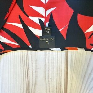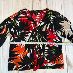 Stylish blouse with bold leaf pattern. Features red, black, and green hues. Ideal for a chic look.