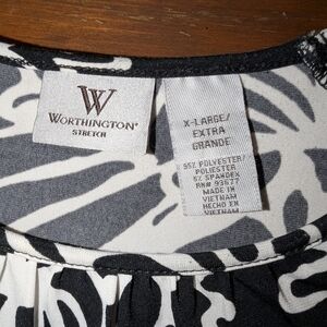This stylish Worthington blouse showcases a bold black and white graphic print with elegant ruffled details. Crafted from lightweight fabric, it offers a chic and comfortable fit, perfect for any occasion.
