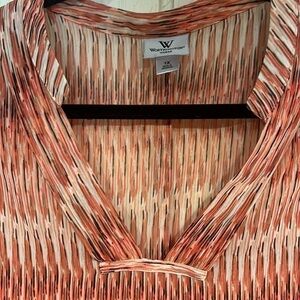 Worthington sheer blouse, size 1X. The length is approximately 28 inches. Features include short, puffy sleeves and an elastic waist. There are a couple of snaps inside, but their purpose is unknown. #sheer #blouse #plussize