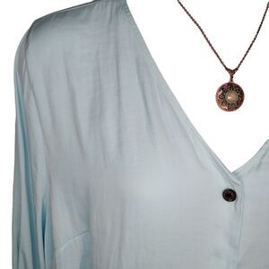 Wear it alone, or belted with the 76" self tie belt. Loose fitting & gathered cuffed 3/4 sleeves, deep v-neck. A camisole underneath is suggested.
