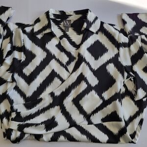 This Worthington women's shirt dress featuring a faux wrap for a flattering fit. It's crafted from woven fabric with a spread collar, long cuffed sleeves, and a knee-length