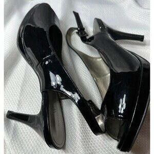 Worthington Shoes Sz 8M BLK SlingBack Patent Leather Adjustable Straps Open Toe Heels Pumps