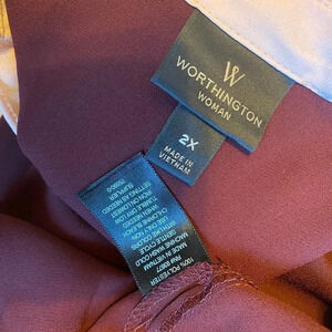 Worthington Silky Button Up Blouse Women Plus Size 2X Ruffle Neck and Sleeves . Good condition maroon color. Fabric is not silk . 4jan24. J. L67