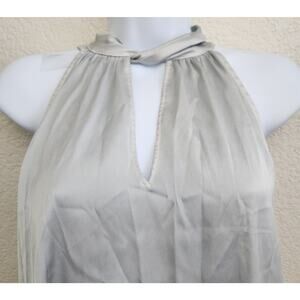silver, twisted halter neck, sleeveless, lightweight, flowy, soft, pleated neck, rounded hem, back keyhole closure