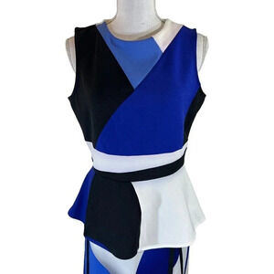 This Worthington Industries suit set is a stylish addition to any wardrobe. The set includes a geometric pattern skirt and a periwinkle blue top with a peplum design. The sleeveless top is made from a blend of polyester, spandex, and polyester again. It features a stretch fit and is machine washable for easy care. The set is perfect for a variety of occasions, including parties, formal events, workwear, and business settings. It is available in size medium and is a regular fit for women. The suit set is not handmade and was manufactured in Indonesia.