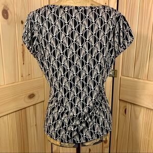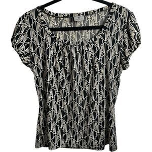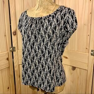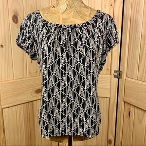 Nice black tunic with a white and beige leaf pattern. It’s really silky soft with cute elastic capped sleeves. A very comfy top.