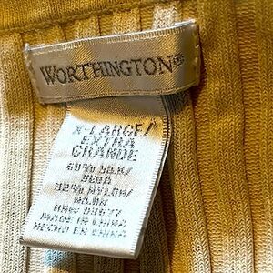This Worthington tank top features a ribbed, fitted design in a stylish tan color. The sleeveless style and scoop neckline make it perfect for layering or wearing alone in warmer weather. Crafted from a stretchy knit fabric, it offers both comfort and a flattering silhouette. Pit to pit 16” w/o stretching.
