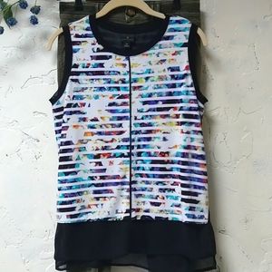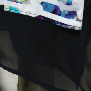 Very pretty and dressy top! Wear it to the office and into the evening. There is a full sheer lining that extends 3.5" in the front bottom and 5.5" in the back. Measures 18" across under the arms and shoulder to hem is 26"/28".