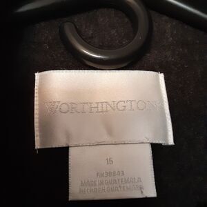 This is a women's Worthington trench coat in a gray solid pattern, made of wool nylon cashmere blend with a polyester lining. It features a long length, long sleeves, button closure, and size 16. The coat is suitable for various occasions like travel, parties, casual wear, formal events, workwear, and business attire. It has pockets, is dry clean only, and is ideal for winter, fall, and spring seasons.