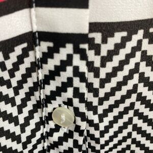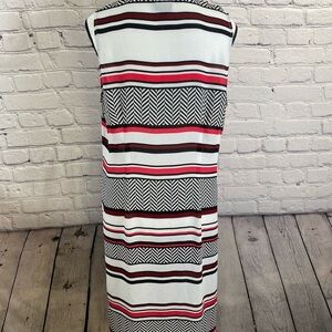 Worthington geometric tunic top size medium. The graphic quality of this top is amazing. It mixes black, white, bright pink, and maroon. Mixing in geometric fabric. Made of an ultralight rayon. This is a sleeveless item that buttons down the front. The hem in the back is longer and is split at the side seam. Note, it’s missing one bottom white button.