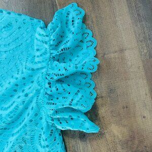 Add a pop of color to your wardrobe with this beautiful Worthington turquoise lace dress. Featuring eye-catching scalloped edges, elegant flutter sleeves, and a flattering V-neckline, this fully lined dress is perfect for summer events, weddings, or date nights. The shift silhouette offers a comfortable, easy fit, while the intricate eyelet lace overlay adds a touch of sophistication.