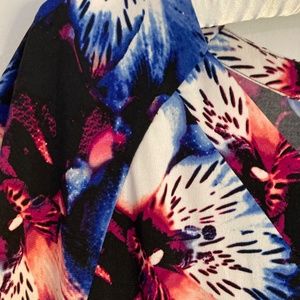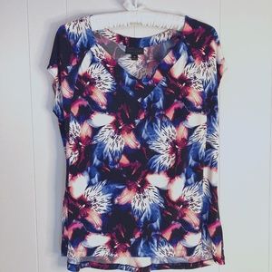 Vee Neck Raglan Cap Sleeve Tee shirt style Top. Beautiful blue, pink and black floral print. Easy care 95% polyester and 5% spandex.