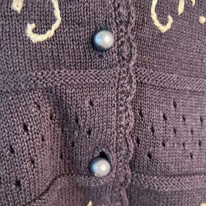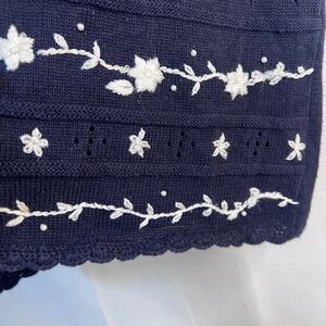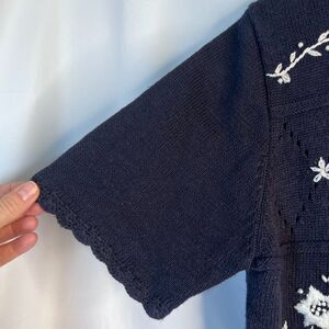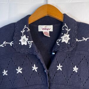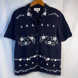 Worthington Vintage Navy Embroidered Crochet Knit Short Sleeve Button Up Sweater Large