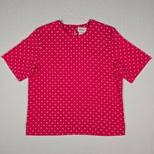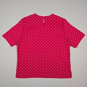 Bright vintage Worthington blouse featuring a bold pink base with white geometric square print. Short sleeves, crew neckline, and lightweight polyester make it perfect for retro styling, summer layering, or casual modcore looks. Size Large, excellent vintage condition.