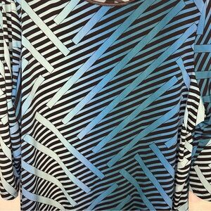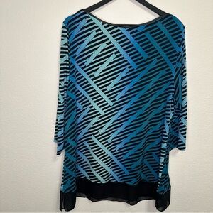 Stand out in style with this vibrant geometric tunic top by Worthington Woman. Featuring shades of blue and teal on a black background in a striking angled stripe pattern, it’s designed with a sheer chiffon-like trim at the hem and a flattering tunic length. Made with a stretchy, comfortable fabric and three-quarter sleeves. Women’s size 1X and in excellent pre-owned condition.