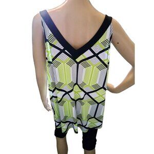 plus size tunic, geometric print top, sleeveless tunic, V-neck shirt, Worthington top, lime black shirt, casual plus top, women's 2X tunic, bold pattern top, sleeveless blouse, polyester tunic, relaxed fit top, Worthington Woman