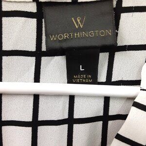Worthington Woman's Blouse Size LARGE Pullover High/Low Long Sleeve Black/White. Ships fast. Measurements and pictures are taken of each garment/item and are included in the listing. Item is free from stains, rips or observed issues unless otherwise noted in listing.