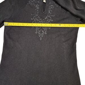 Worthington Womens Black Knit Keyhole Tie Front Embroidered Bell Sleeve Size Medium. Please see pictures for measurents. 🌟If you like what you see please checkout my closet. Bundle and save on shipping. Happy Shopping 🛍 😉